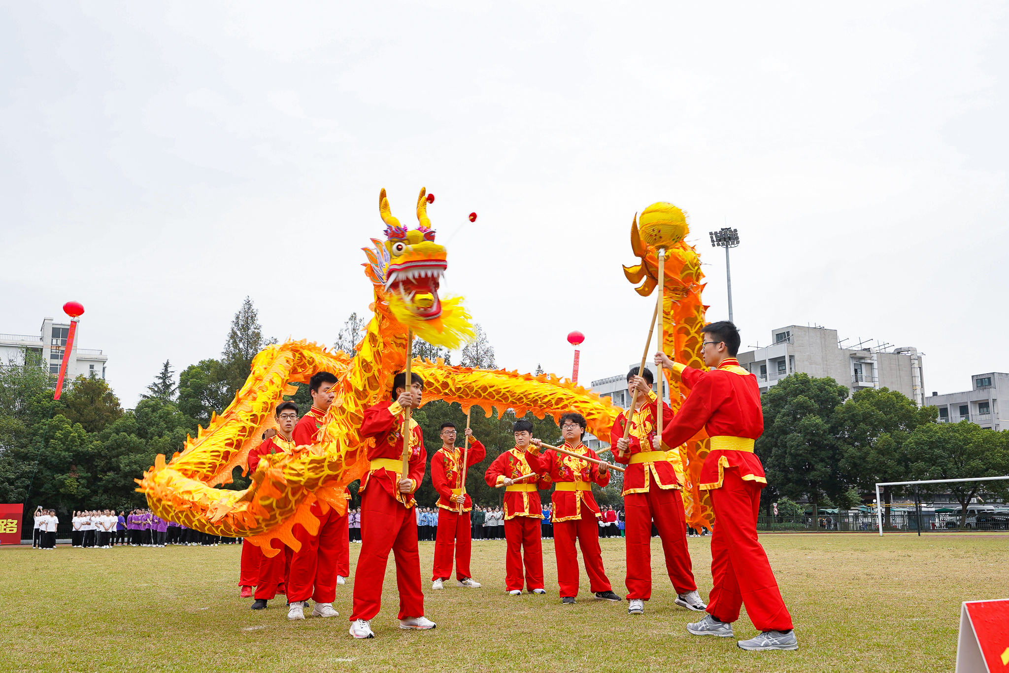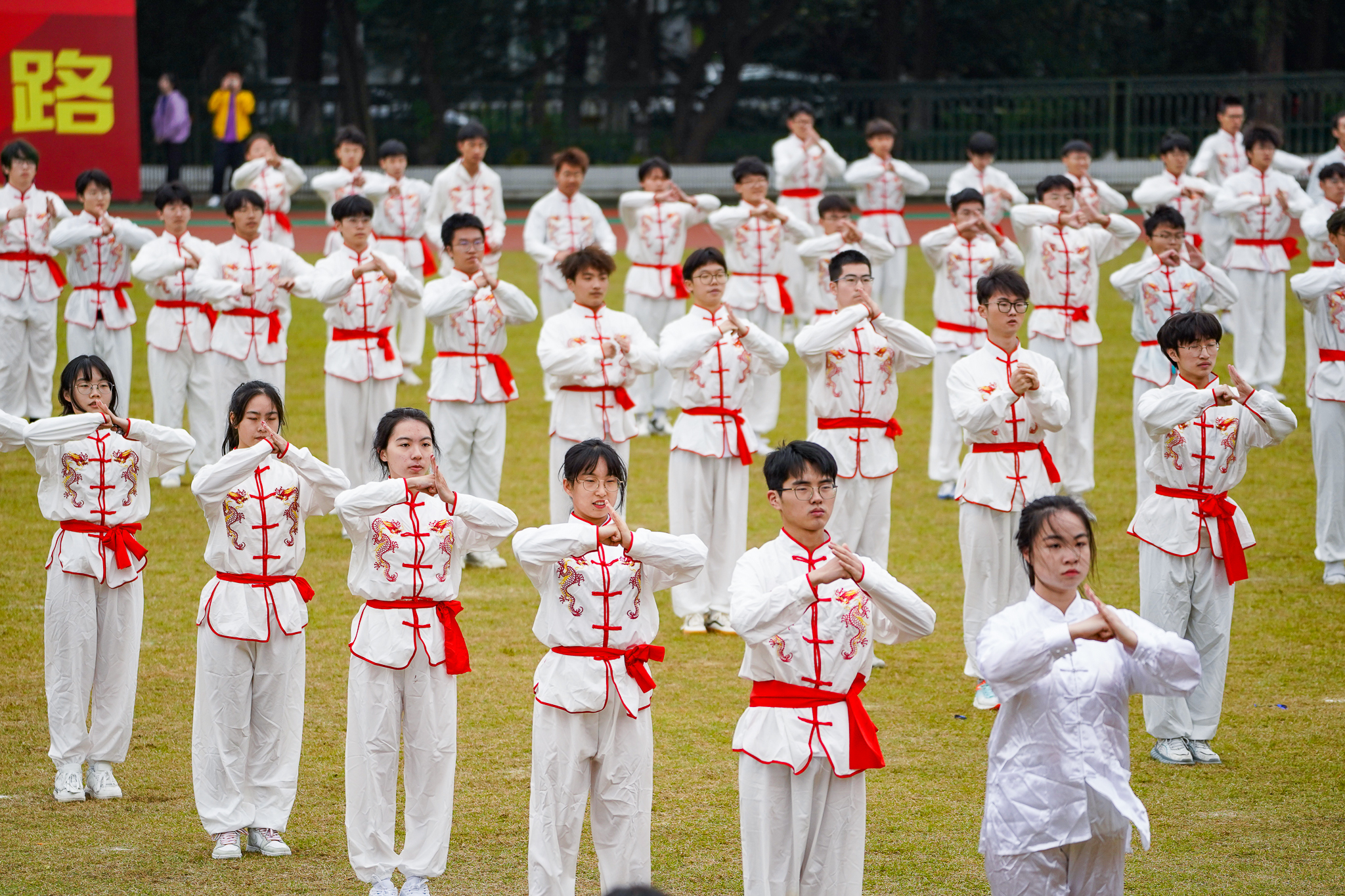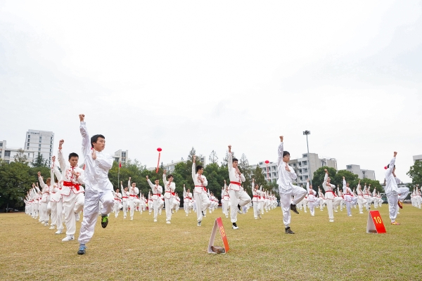 武术社团的舞龙舞狮表演令在场的所有人眼前一亮。伴随着传统民乐的节奏,成员默契配合、紧密衔接,以扭、挥、仰、跪、跳、摇等姿势,完成了八字舞龙、奔跑游龙、穿腾跳跃等技术动作,栩栩如生地诠释出龙狮的磅礴气势。而这场精彩绝伦的龙狮共舞以“中国龙”三个字造型结束,展现了充满凝聚力和创造力的民族传统文化,将现场的氛围推到了最高潮。