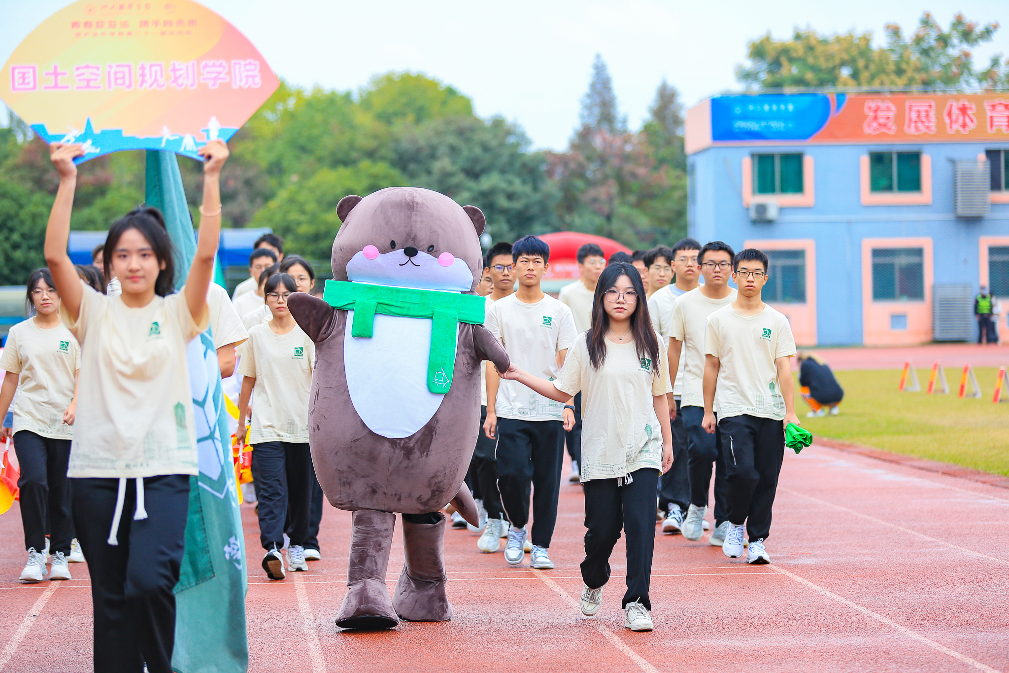丹桂飘香,旌旗飘扬。在激昂的进行曲中,国旗队、校旗手、红旗队、由十二个学院组成的学生方队以及教工代表队相继入场。他们昂首阔步,英姿飒爽,热血涌动,以最饱满的姿态和最嘹亮的口号为运动会吹响启程的号角,彰显城院师生昂扬的斗志。